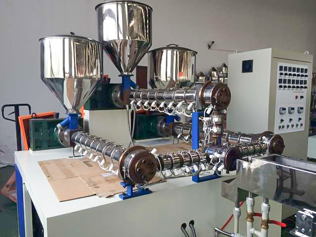 ML13A三拼色吸管共擠擠出機(jī)組由:擠出機(jī)、機(jī)頭、冷卻定型裝置、牽引切割裝置、理管輸送裝置(選配)等部分組成,生產(chǎn)三拼色的花色吸管。采用全新BM分離型參數(shù)設(shè)計(jì)的45mm直徑螺桿:長徑比28:1,塑化效果好,雙螺桿平行布置,擠出量大,出膠穩(wěn)定;是生產(chǎn)特種花色飲料吸管的專業(yè)設(shè)備。