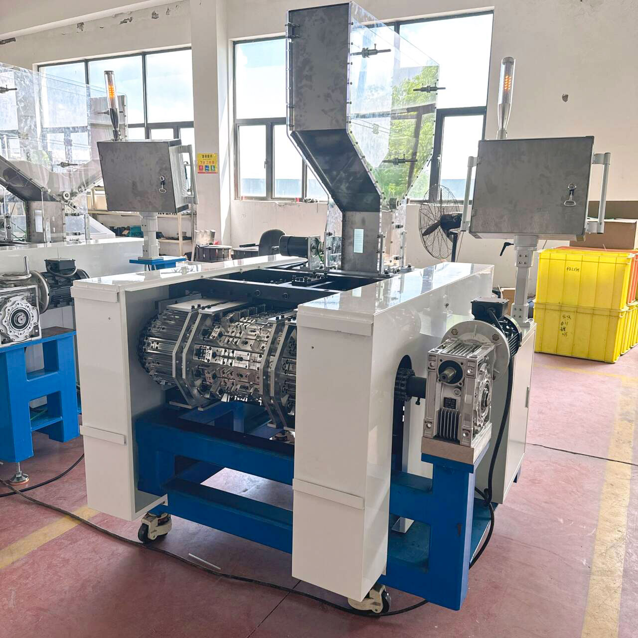 3.出料裝置增設(shè)不銹鋼接料斗,勞動(dòng)強(qiáng)度低,1人可以操作2臺(tái)設(shè)備
